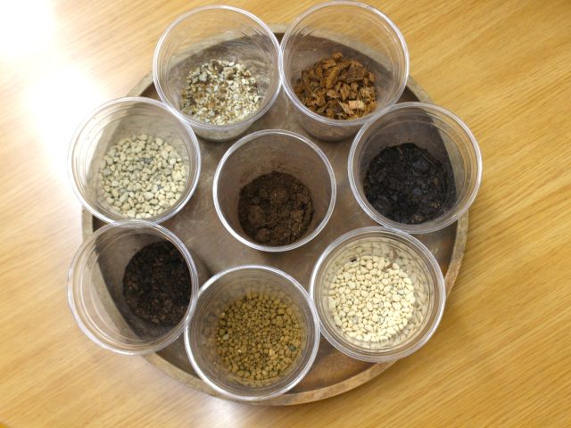 今回は、赤玉土や鹿沼土、軽石、堆肥などの資材を手に取り、特徴を学びながら培養土をブレンドします。