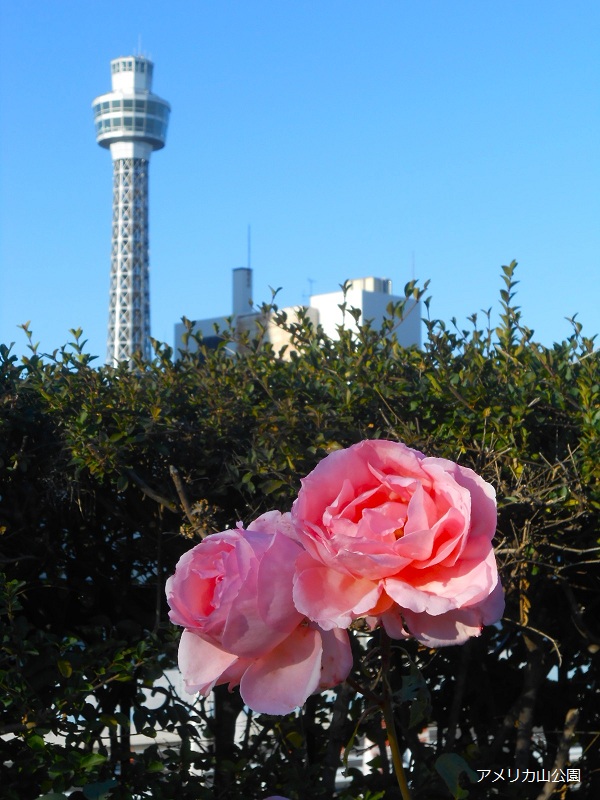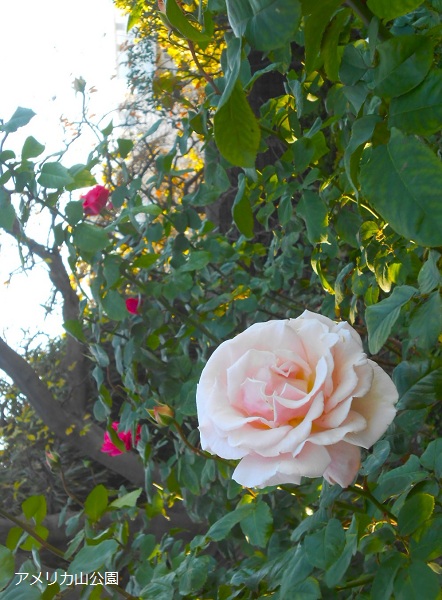 元町側にある小庭園の入り口に咲くピンクのバラは’桃花’。