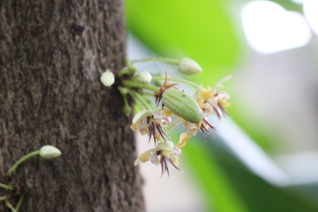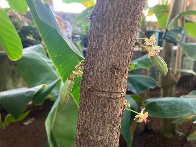 かわいらしい花たちの中に、カカオの実がなっていました!