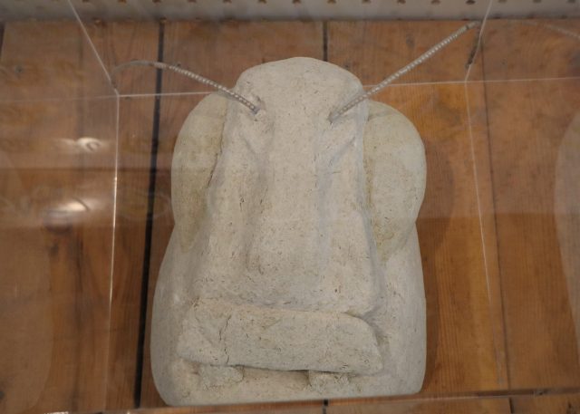 トノサマバッタのフンで出来た仮面を展示しています。