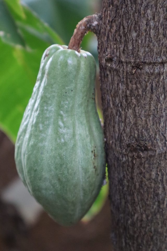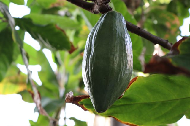 ねったいかんでも昨年初めて結実したカカオの実が、