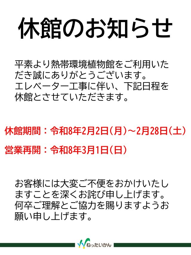イベント情報 2月休館のお知らせ 開催予定 平素より、板橋区立熱帯環境植物館をご利用いただき誠にありがとうございます。 エレベーター工事に伴い、下記日程を休館とさせていただきます。 休館期間:令和8年2月2日(月)~2月28日(土) 営業再開:令和8年3月1日(日) お客様には大変ご不便をおかけいたしますことを深くお詫び申し上げます。 何卒ご理解とご協力を賜りますようお願い申し上げます。 詳細データ 開催期間 2月2日(月曜日)~2月28日(土曜日) 一覧へもどる