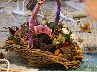このアレンジメント教室では、リボン等の装飾と公園内の木の実等を組合せて季節のアレンジメントを作ります!