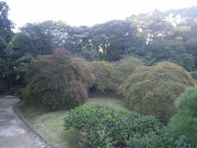 まずこちらは、見浜園に入ってちょうどまっすぐに進んだ池の縁にあるモミジです。青い葉が目立ちますが、