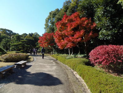 上の池(見浜園入口前の池)も色づいています。ここは、海からの風で潮害を受けやすく傷みやすいのですが、何とか色づいてます。