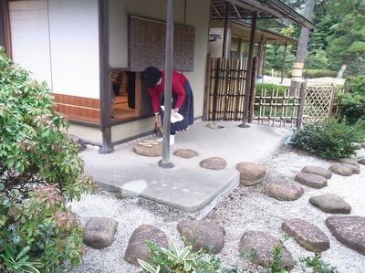 では松籟亭の小間、四畳半の茶室はどのような基準で作られたのかという質問したところ近世で作られたほとんどの四畳半の茶室は‘又隠’(ゆういん)を手本にしています、とのことでした。‘又隠’?とは利休3代目宗旦が隠居のために建てたもので京都の上京区にあります。四畳半? 茶室に大きさの決まりはあるの? 宗旦が最初に建てた茶室は一畳台目と言って約1.75畳の茶室で皆様ご存じの‘今日庵’です、また寒雲亭(現在鎌倉市東慶寺)八畳に本床・一畳の控えという茶室もあります。どうもこれらがひな型でそれを参考に様々にアレンジしたものがあるようです。