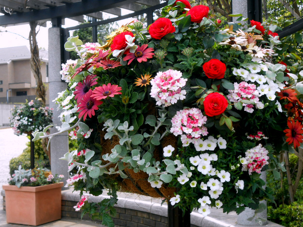季節の草花とミニバラを使い、長く自宅で楽しめるハンギングバスケットを作ります。お持帰り可。