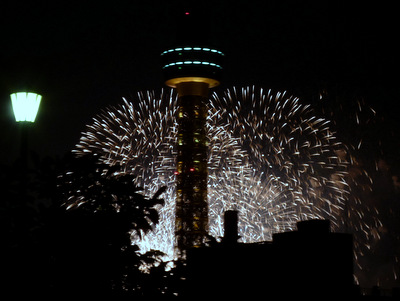 色とりどりの光が踊るなかにマリンタワーが浮かびあがるのが、アメリカ山公園ならではの花火風景。