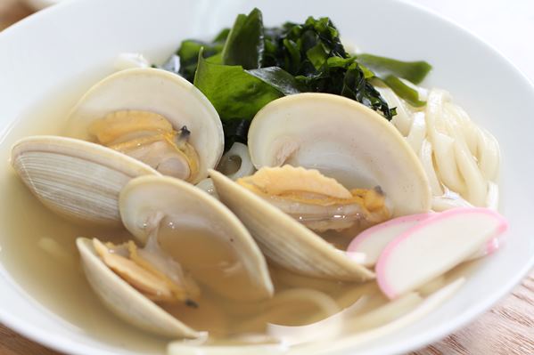 2月から始まった館内のCafé Oasisの「東京湾の海の幸を味わおう!」のメニューの一つ、ホンビノスうどん。
