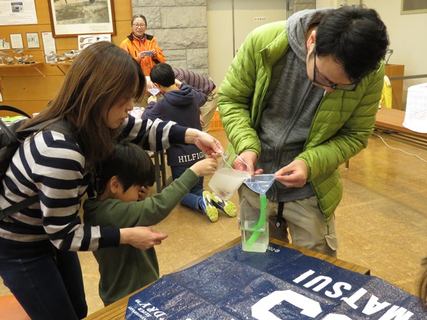 大木さんのユニークな解説と砂糖水や谷津干潟の海水を使った蜃気楼実験でその現象の仕組みを