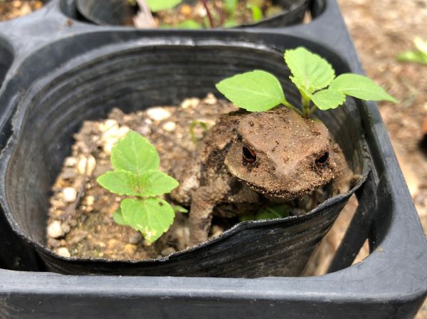 植物の育苗用のポットに5センチほどのアズマヒキガエルがのっていました。