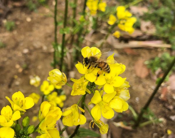 3月に入り、センター前広場のプランターや花壇にも少しずつ花が咲き始め、観察センターで飼育するセイヨウミツバチが花粉や花蜜を集めにやってきています。