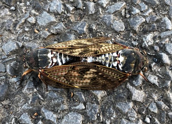 先日遊歩道を歩いていた時、2匹のアブラセミが落ちていたので近づいてみてみると、互いに翅を重ね合わせて交尾をしていました。なぜこんなところで‥と思いましたが、触らずにそっとしておきました。