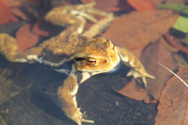 日中の気温が17℃まで上がり、公園内の水辺のアズマヒキガエルも活発に!