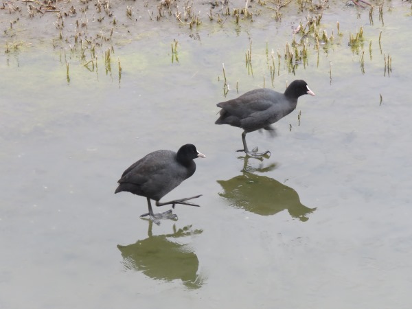 観察センターの前にあるフニフニ池も初めて凍り、今年の初滑り(?)はオオバンでした。