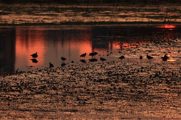 今の時期、渡り鳥のチュウシャクシギが日没時にねぐら入りをします。