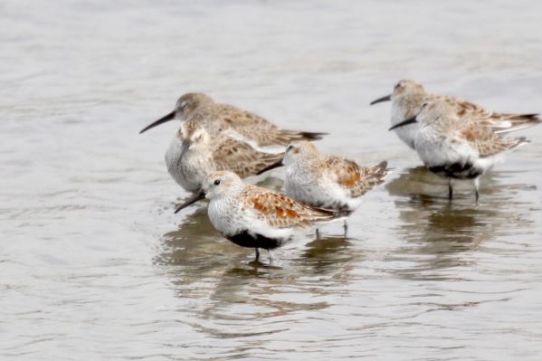 今朝は満潮で、風も強いので観察センターの前にハマシギ やカモの仲間、カワウ、ユリカモメ、ツバメが集まっていました。