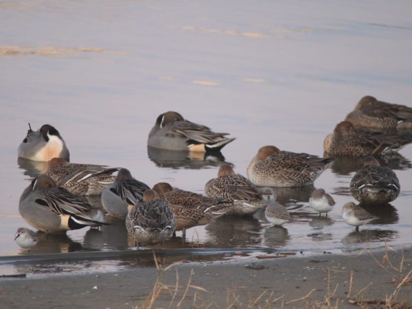 ほとんどがオナガガモでしたが、ところどころにコガモやハマシギなどの姿も。