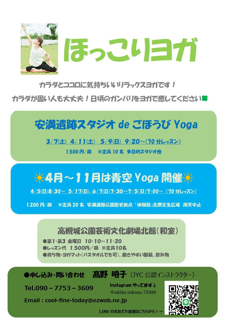 持ち物: ヨガマット、もしくは大判バスタオル、水分、タオル