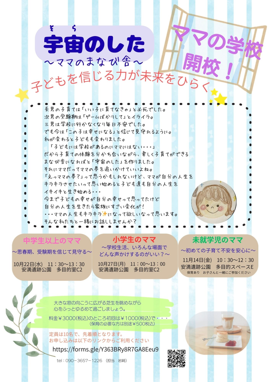 ママ一年生の時は悩みながらの子育てでした。「子どもには学校があるのにママにはない・・・」そう思ったから「宇宙(そら)のした」を作りました。子育ての話はもちろん、ママの人生が楽しくなるひと時になればと思います。ぜひご参加ください。