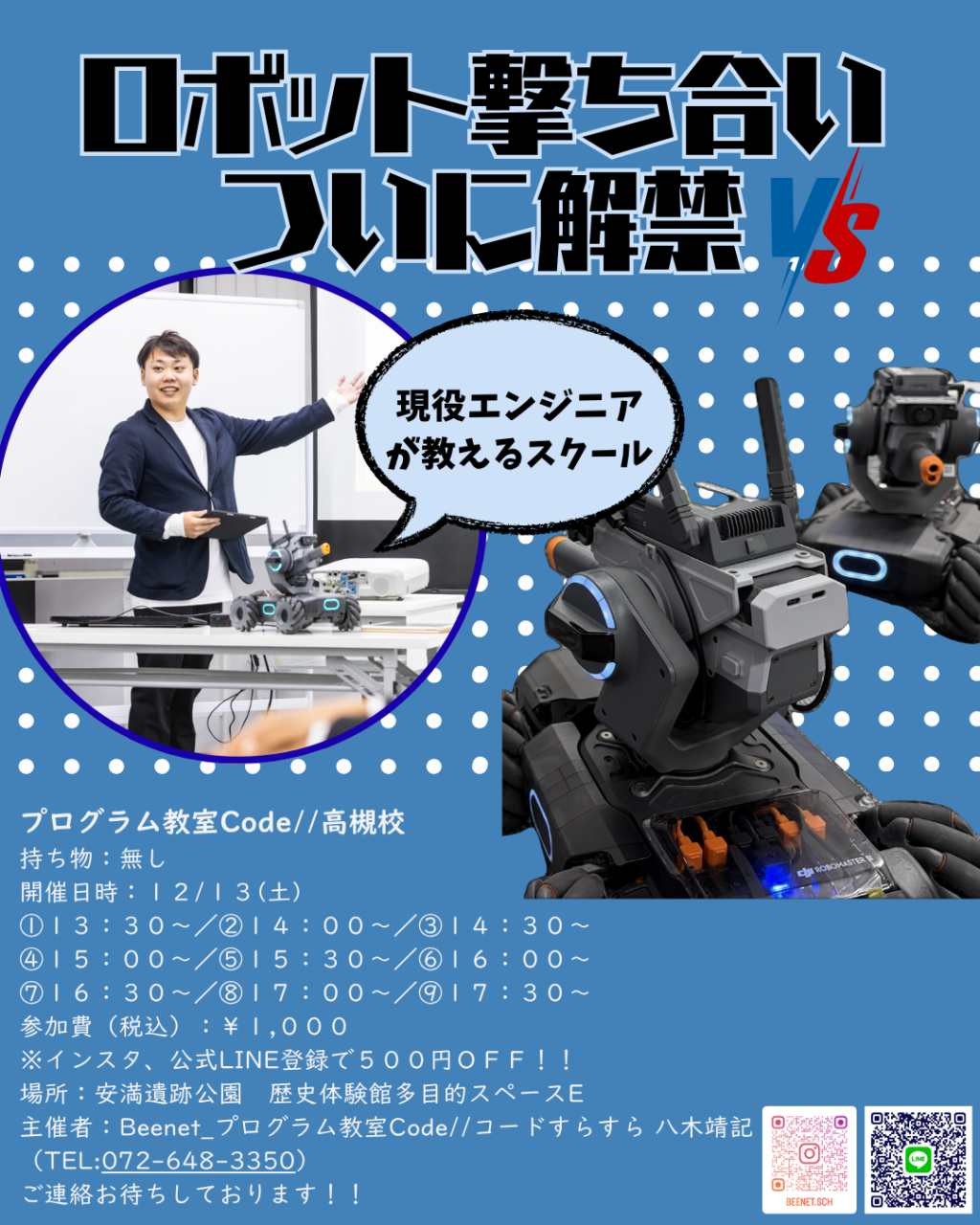 「プログラミングって難しそう?でも家電のリモコンもプログラム!高校教諭免許を持つ現役エンジニアがロボット撃ち合いゲームで楽しく解説。安満遺跡公園で体験してみませんか!」