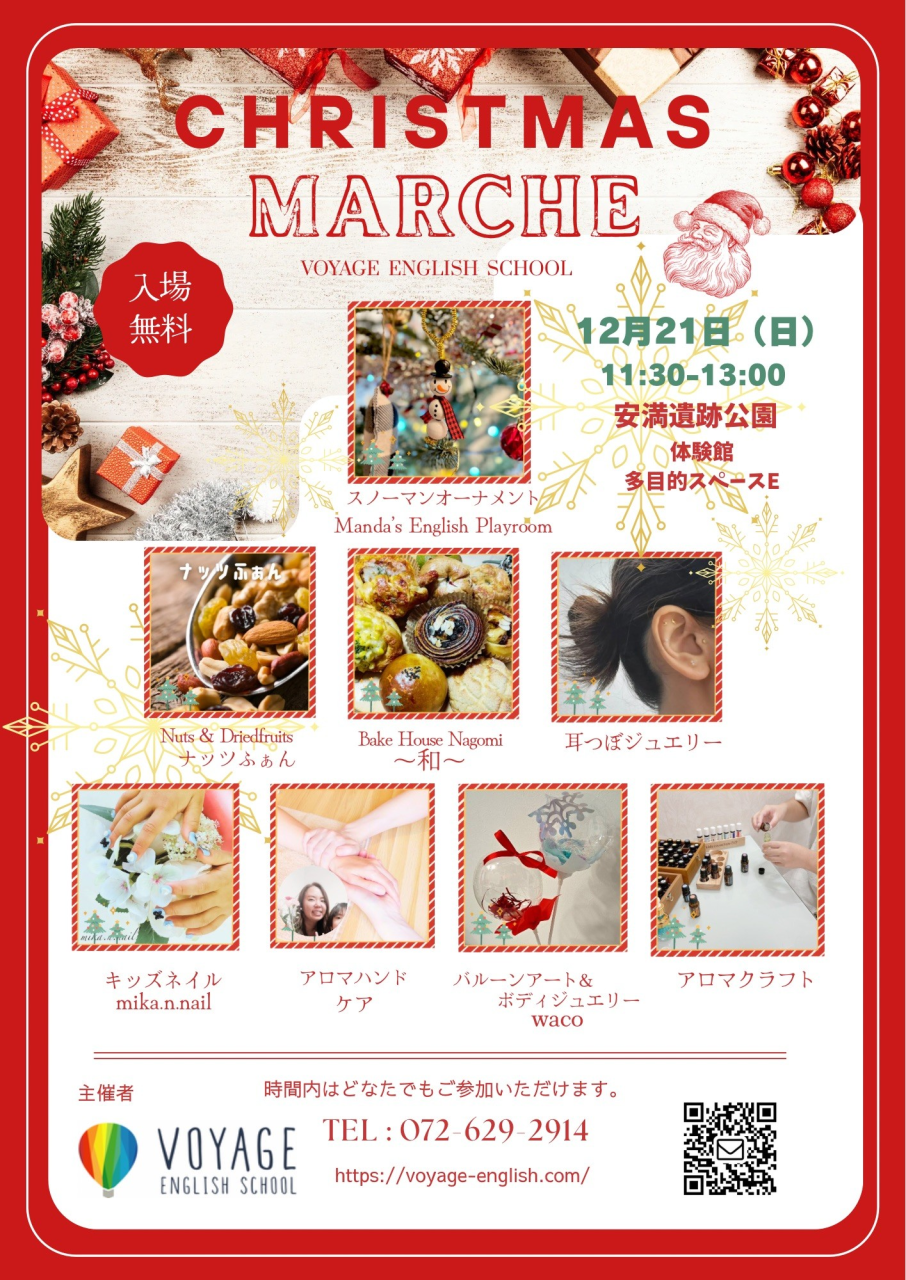 クラフト、飲食、親子でかわいい耳つぼピアスなど 大人も子どもも楽しめるminiクリスマスマルシェを開催いたします。ヴォヤージュ英会話教室の先生たちも参加しているのでどんな教室なのか興味のある方もぜひ、ご自由にお越しください。 詳しくはホームページ『お知らせ』をご覧ください。https://voyage-english.com/