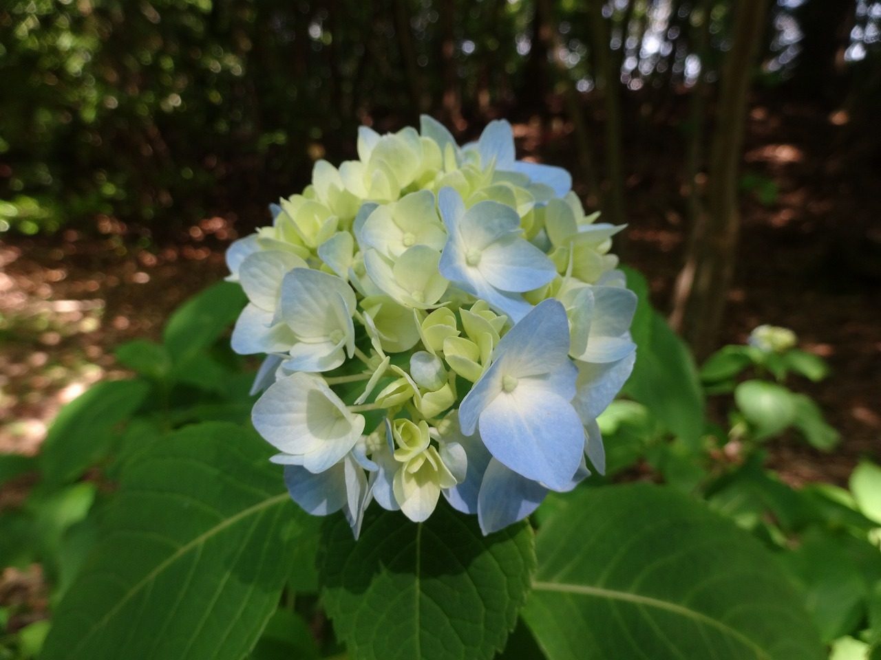 一般的な丸いフォルムとは違った、円錐の形をしたアジサイが咲き始めていました。葉の形も一般的なものとは少し変わった形をしています。