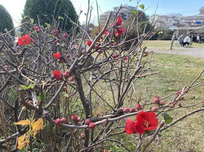 大蔵池公園のボケは、春に伸びすぎた枝を剪定してもらったので、今年はたくさん花芽を付けてくれました。
