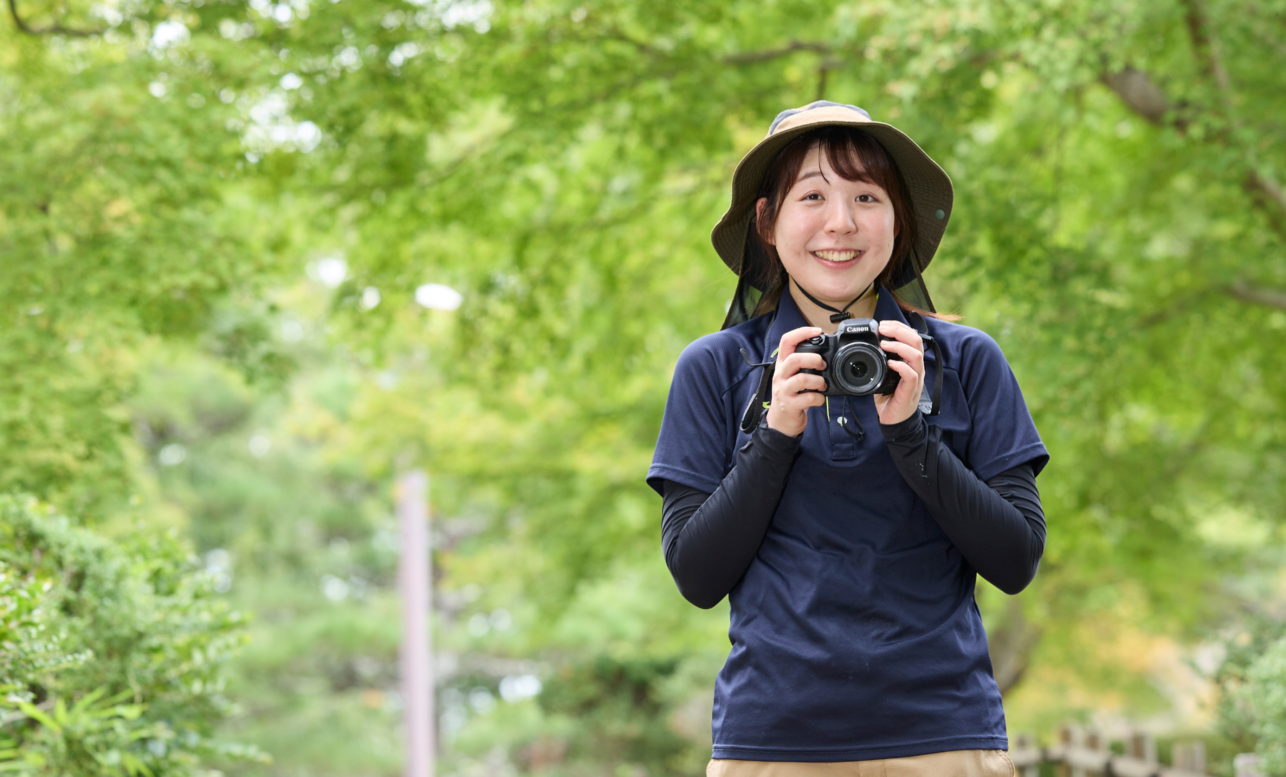 滋賀県営都市公園の「びわこ文化公園」で管理・運営の業務に携わっています。主な業務はイベントの企画・運営や広報ですが、公園はシフト制なので、経理や事務書類の取り扱い、窓口での対応など、他の業務も幅広く担当します。最近は公園のInstagramを始めたため、他のスタッフとも協力して、写真を撮ったり、情報探しをすることもあります。また、園内の生きものを紹介するパンフレットや、イベントのチラシも作っています。
