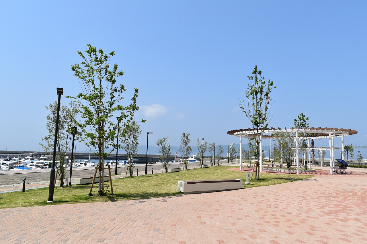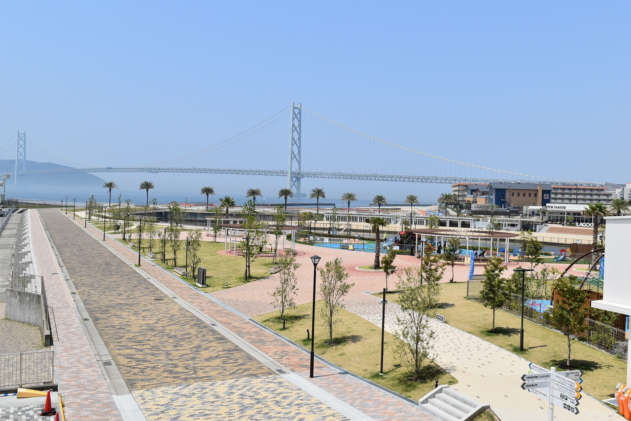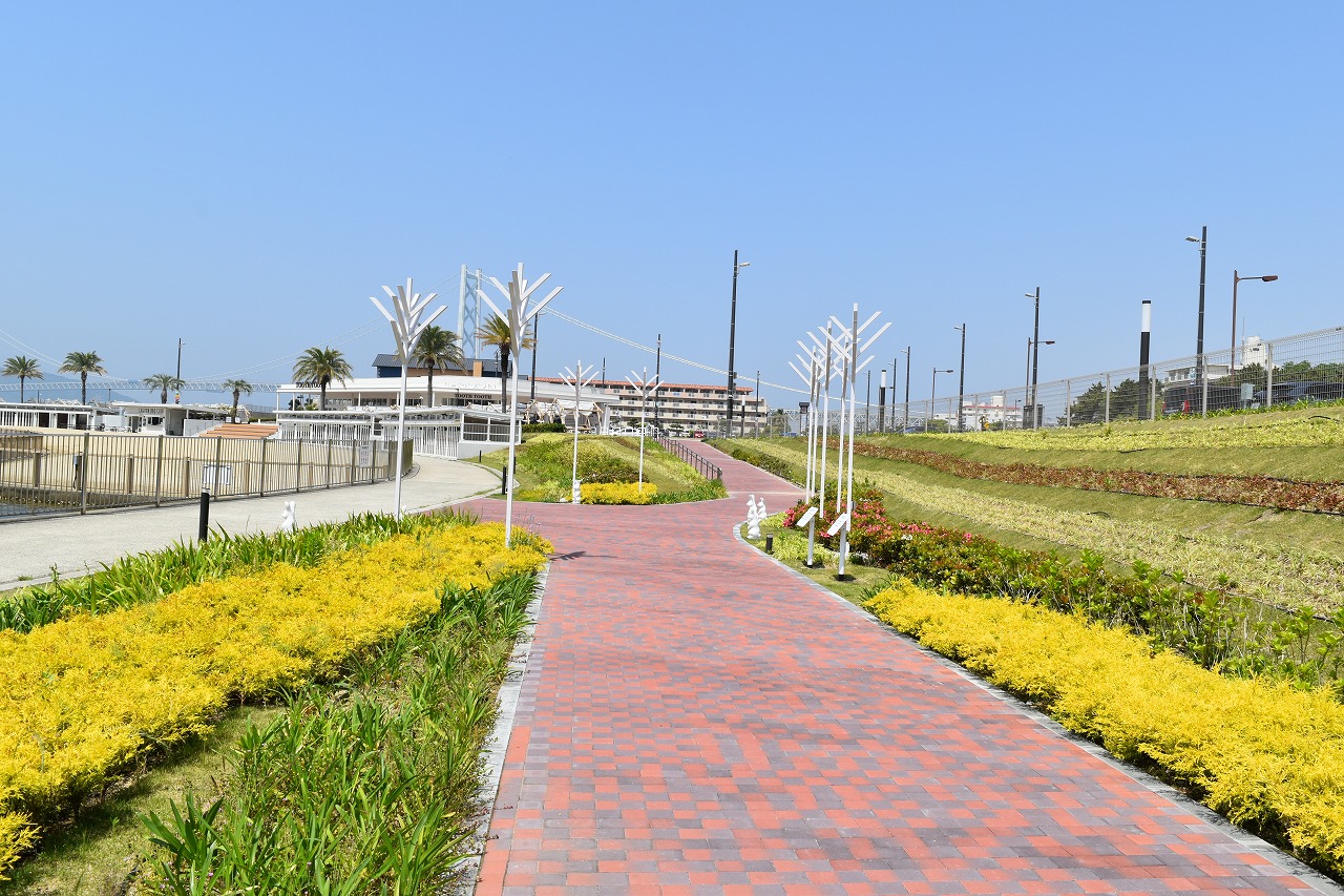 当社では、メインエントランスのゲートツリーとして2本のオリーブを植栽施工したほか、明石海峡大橋を借景としたフォトスポットにもなっている「BE KOBE」のモニュメントをはじめとする「LAGOON COMMUNITY PARK」の外構・植栽工事に携わりました。