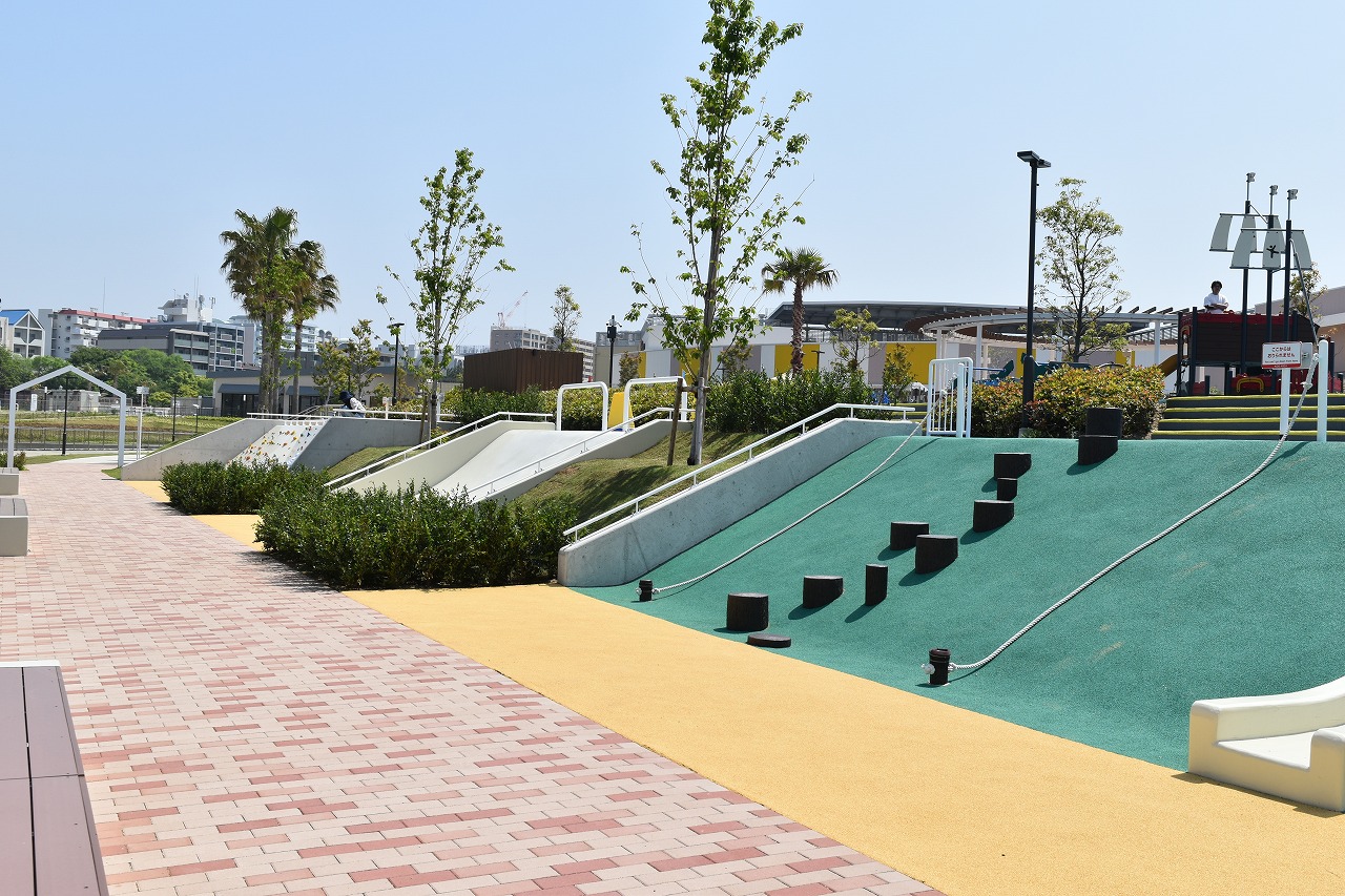 また、アクティビティレジャーゾーンでは、子どもたちが自由に遊ぶことができる滑り台やハンモックデッキなどの地形を活かした遊具施設、海を眺めながらお過ごしいただける広場などがあります。建替え前から残るヤシの木を活かしつつ、リゾート感を演出する樹形の美しいオリーブやサルスベリ等、海沿いらしい爽やかな植栽配置となっています。