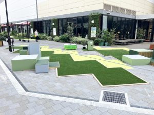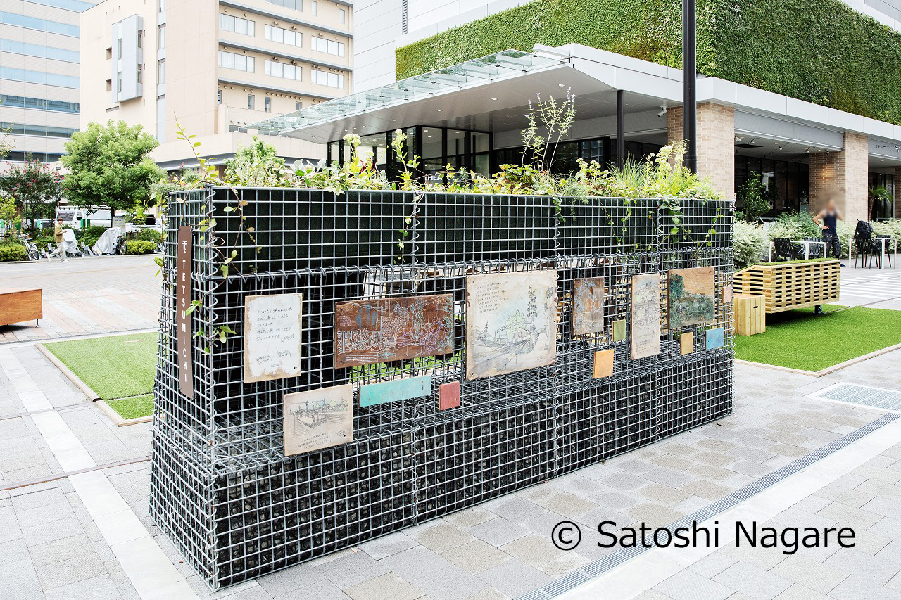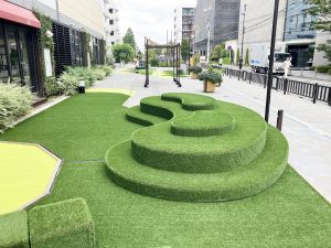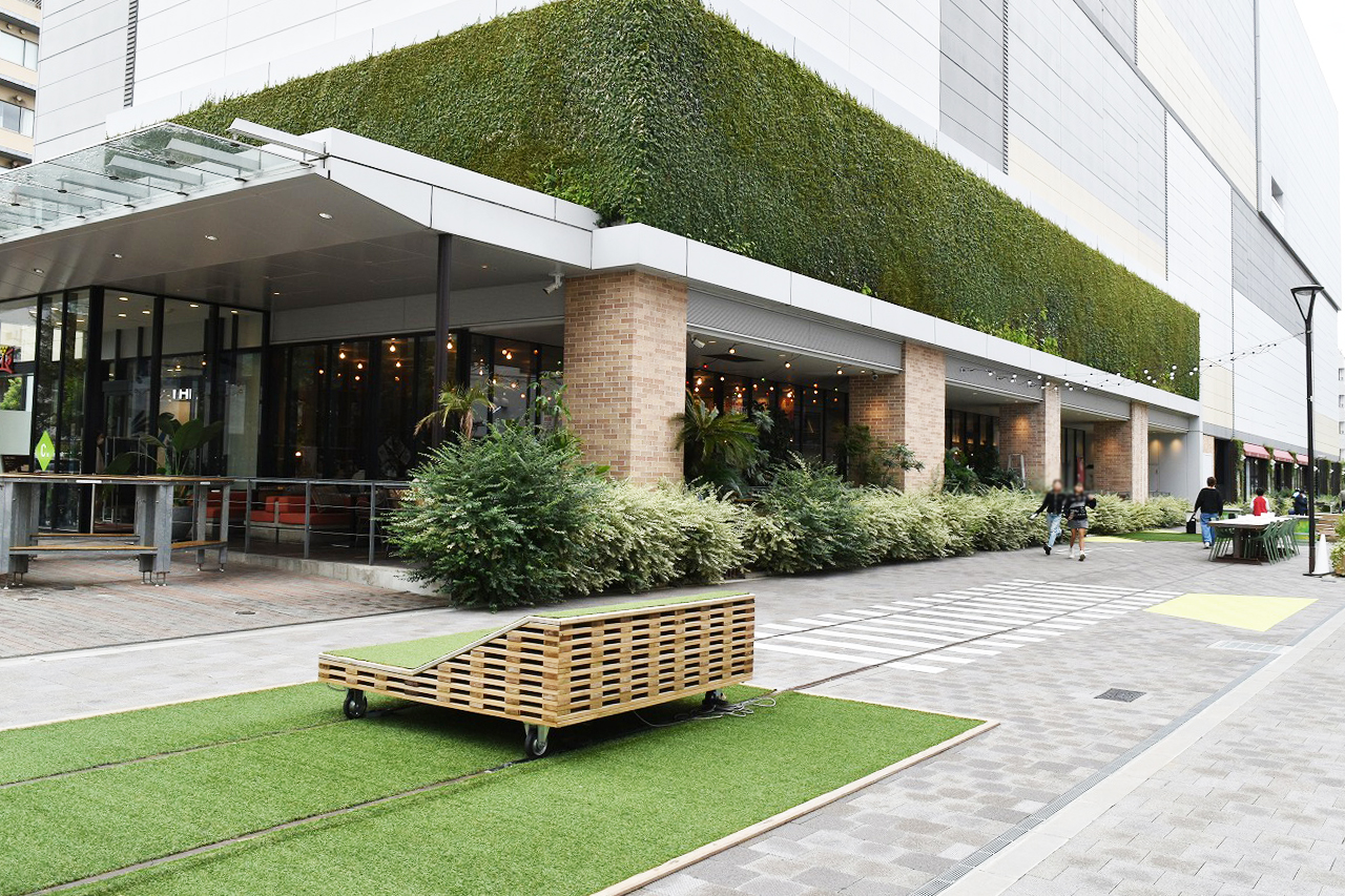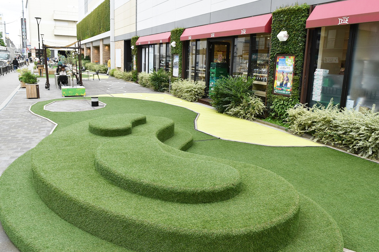 「(新)てつみち」には、子どもたちが自由にお絵描きできる黒板や、人工芝のプレイヒル、埋設レール&車輪付きのベッド、(旧)てつみちの設備をリメイクした植栽付きベンチやテーブルなど、歩行者空間と憩いの場が共存するような空間となっています。