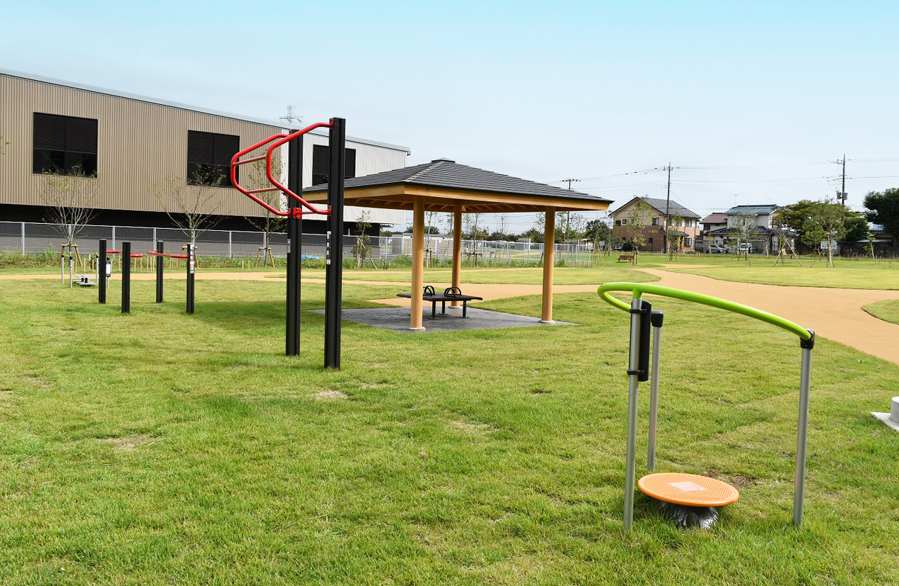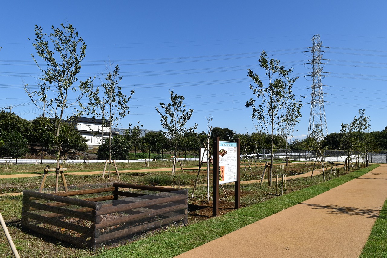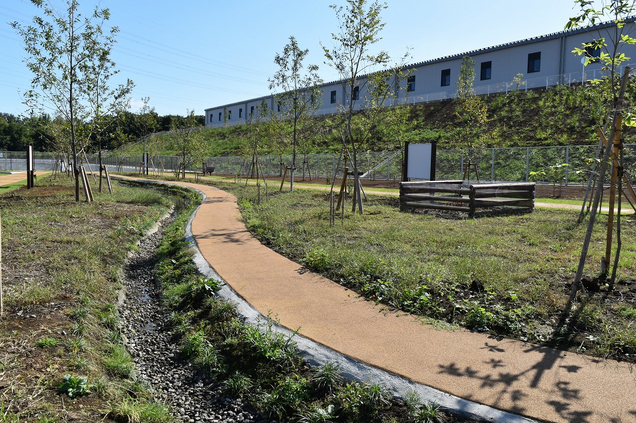 最終処分場を囲む緑地には、市民の憩いの場として使っていただける健康遊具や東屋を備えた「多目的広場」、築山やターザンロープなどの遊具が楽しめる「わんぱく広場」、落ち葉や枝などを集めて生きものの住処となるエコスタックや水路が設けられた「生物多様性体験広場」などの施設が整備されています。