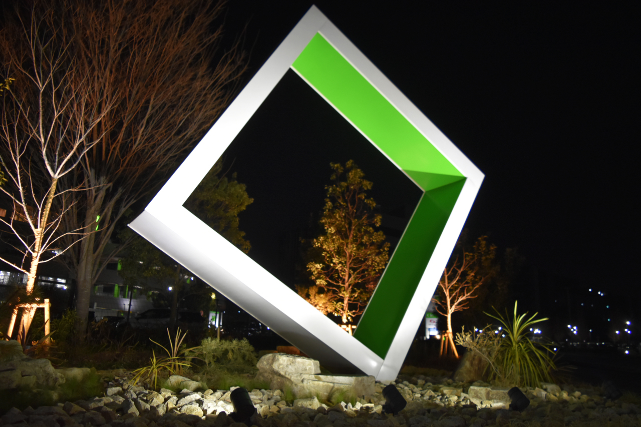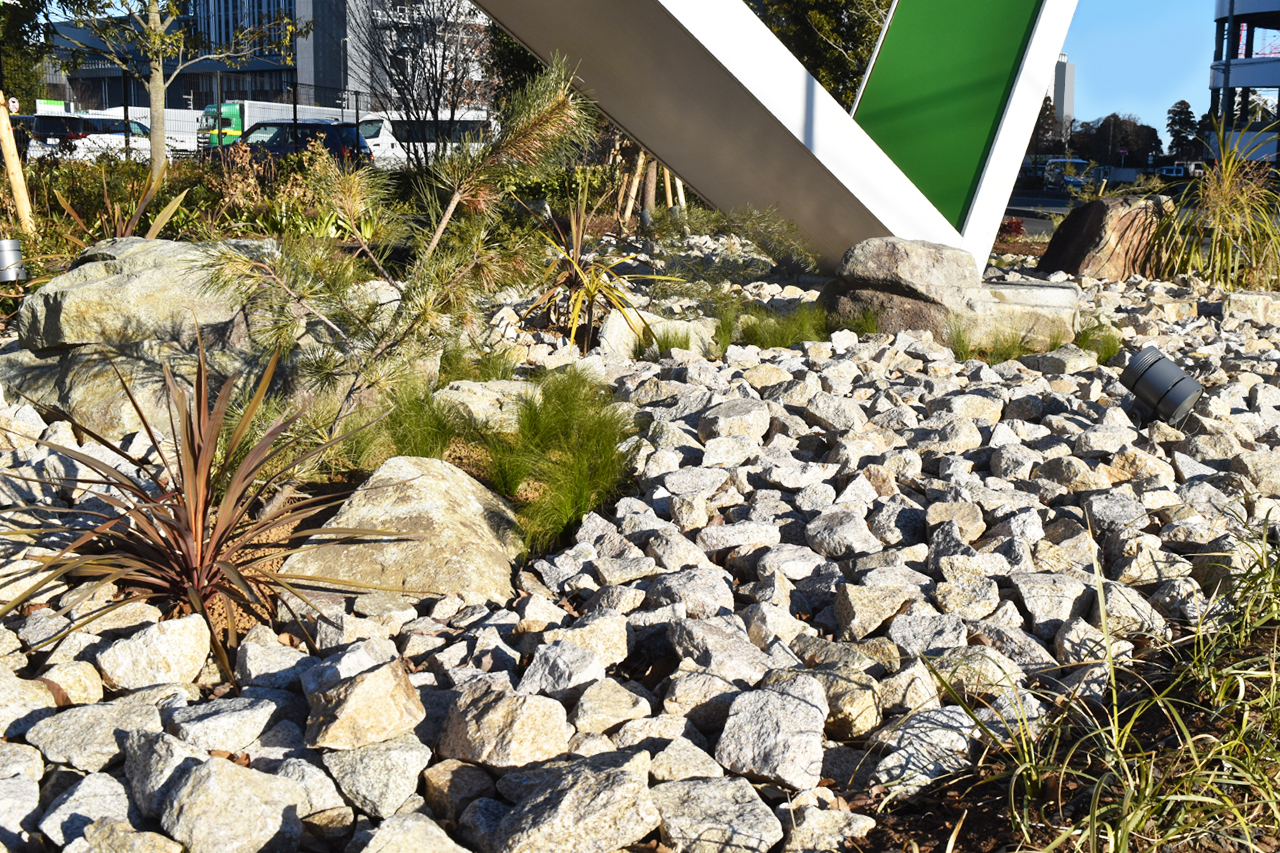 なかでも特に、ノース・サウスの交差点前に設けられたモニュメント周辺は、対面の商業施設「theGreen」の雰囲気とも統一感を感じられるよう工夫しています。また、イーストにはキャニオンロックや割彩石を用いたロックガーデンを設け、常緑品種との景観を楽しんでいただけるような空間としました。