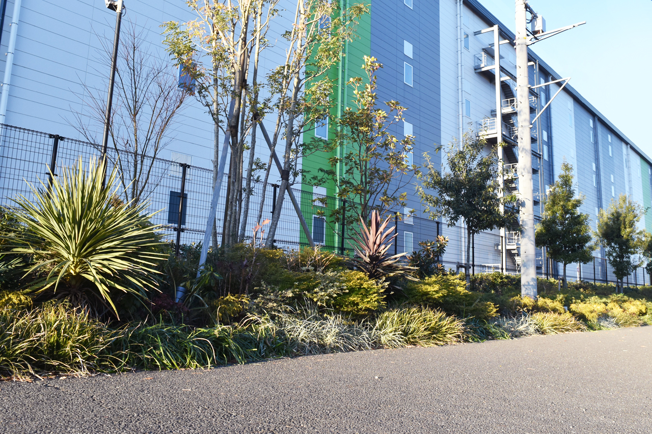 この「グッドマンビジネスパーク」のうち、主要施設であるノース(敷地面積 約6.23万㎡)、サウス(敷地面積 約6.35万㎡)、イースト(敷地面積 約5.9万㎡)の3棟の外構植栽リニューアル工事を、当社が担当しました。
