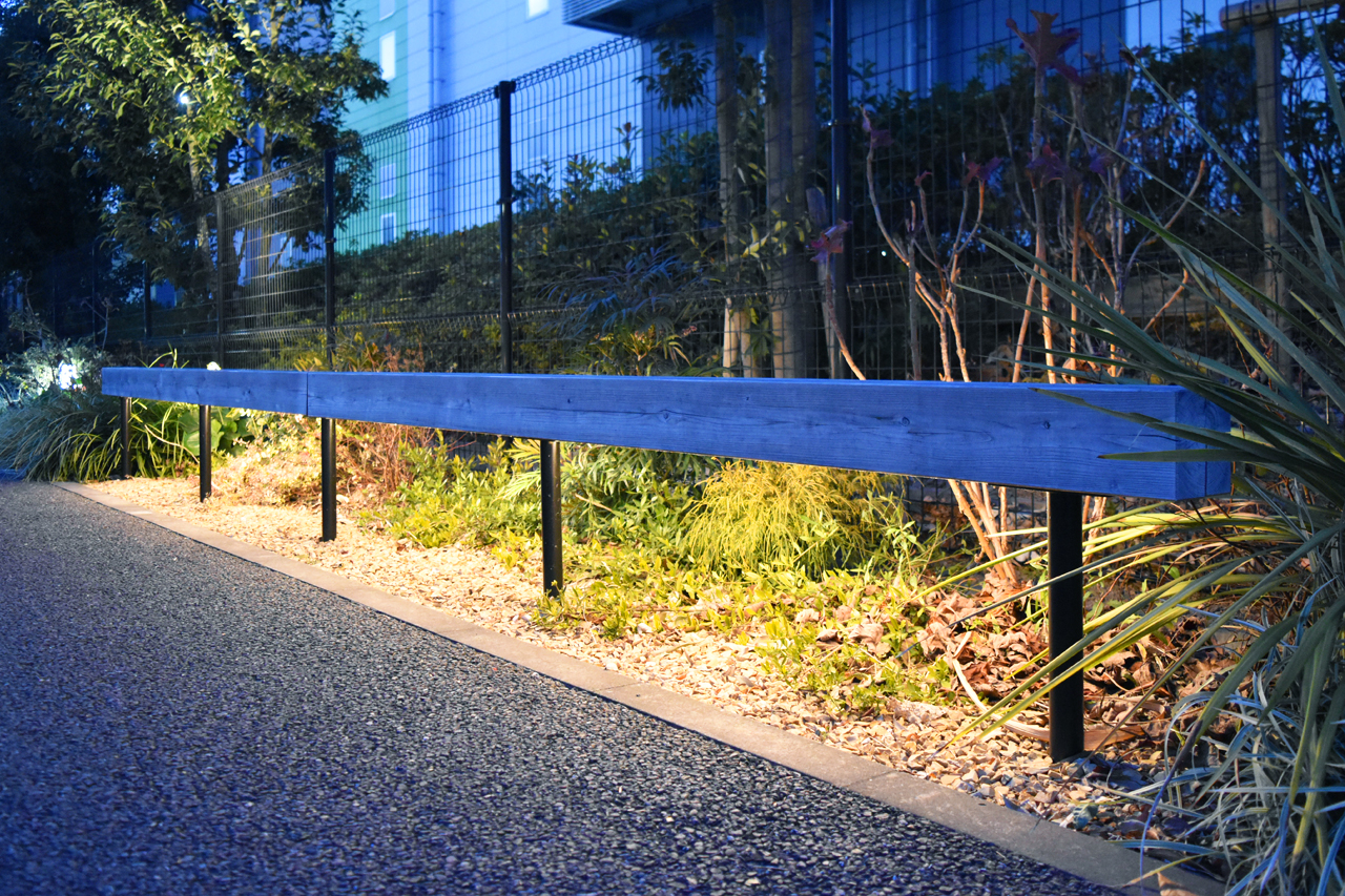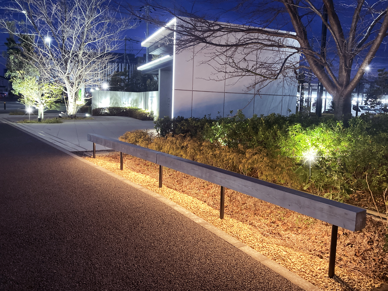 バス停周辺には、夜間でも利用しやすいようライトアップされるベンチを配し、働く方々の利便性向上も図っています。