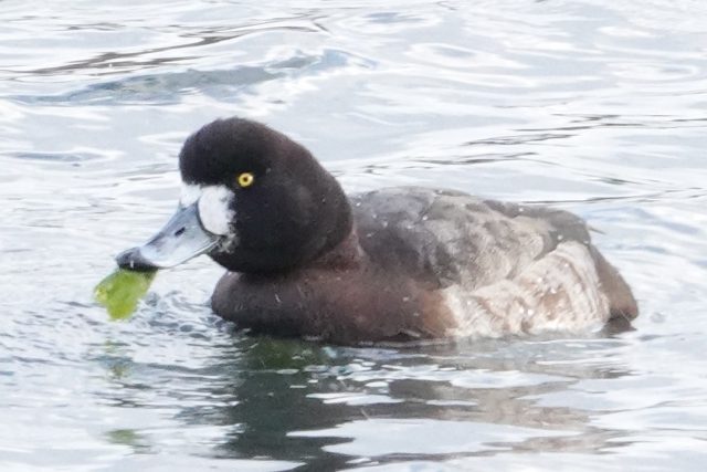 干潟の西側で、スズガモが何度も潜水して食べ物を探していました。貝を丸のみにしたり、アオサをもしゃもしゃと食べたりしていました。