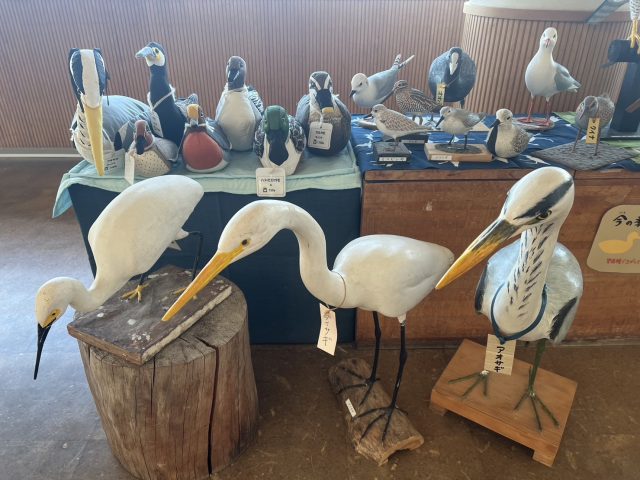 冬になり、カモ類やカモメ類などの冬鳥たちが谷津干潟に飛来してきているため、現在はそれらのカービングが展示されています。写真の左側が水辺の野鳥たちで、右側が陸の野鳥たちです。ちなみに、カービングの他にも本当の重さを再現したぬいぐるみもあり、それらは実際に持って重さを体験できます。