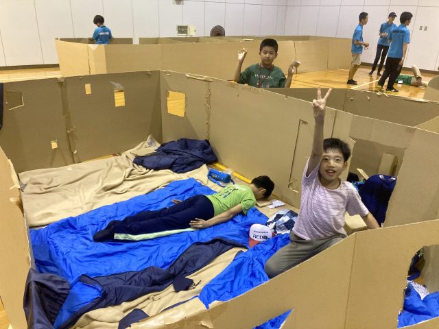 みんな快適な空間を自分たちで考えて作っていて、避難所体験ですが楽しそうに過ごしています。