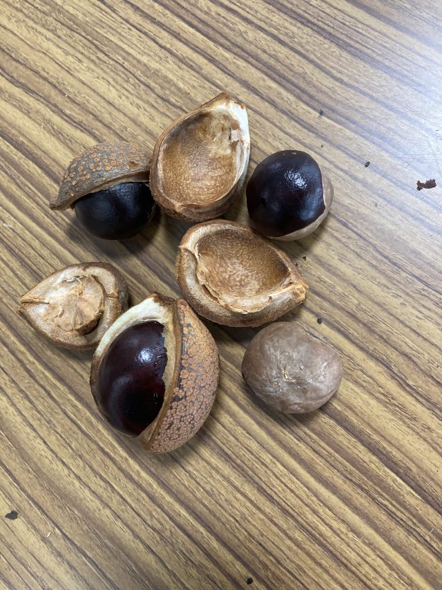 自然の家玄関前のトチの木は一足早く、熟した木の実を落としています。