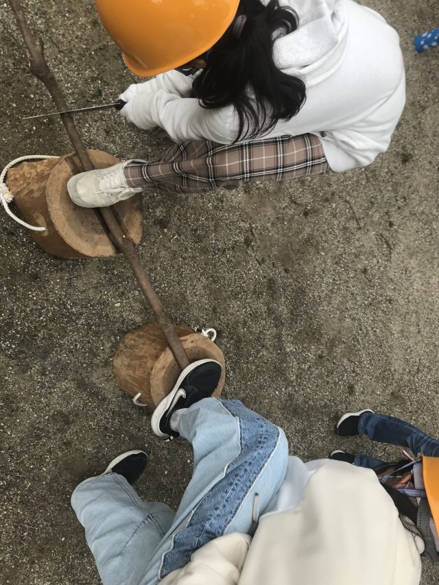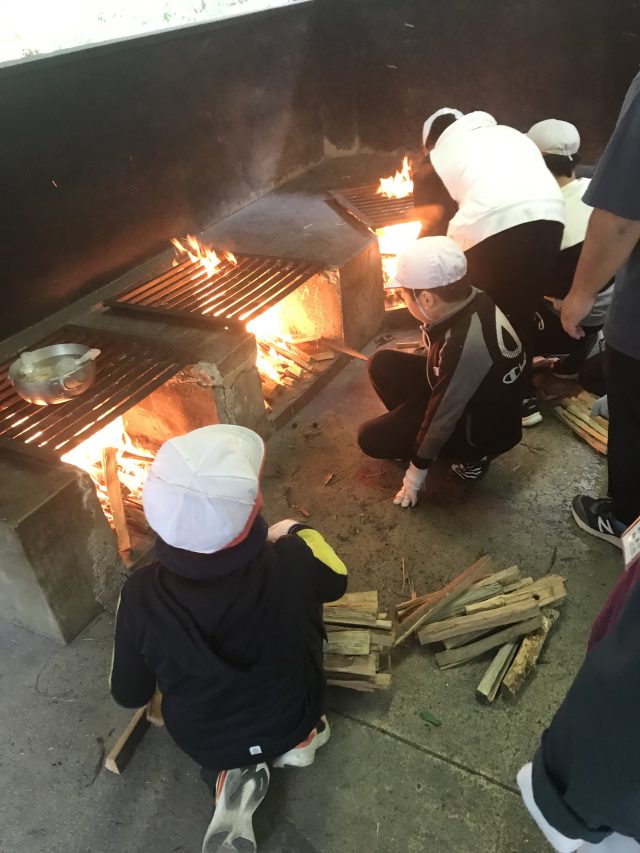 火おこしも先生が持ってきた最強の着火剤でうまく火が薪に移りましたが、そこから維持し続けていくのは根気が必要で、班で協力し薪や葉っぱを集めて頑張っていました。