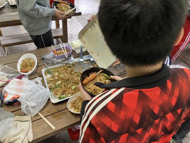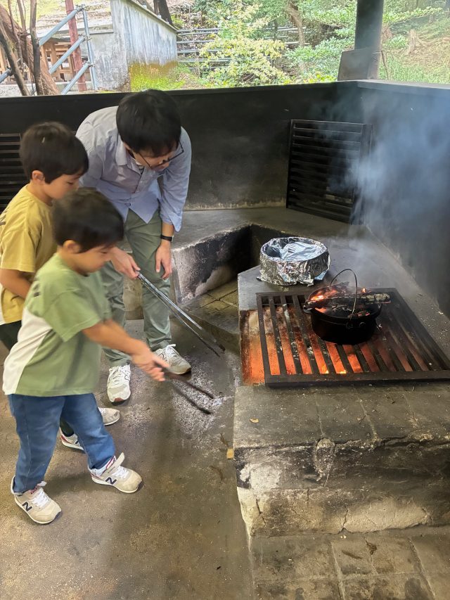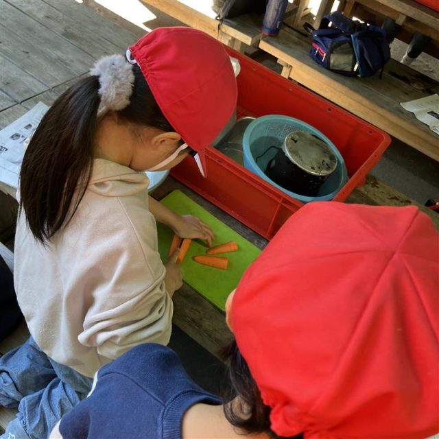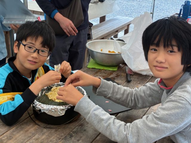 この日は野外炊事でカレー作り。班ごとに協力して野菜を切ったり火を起こしたりしながら、美味しいカレーを完成させました。自分たちで作ったカレーの味は格別だったと思います。