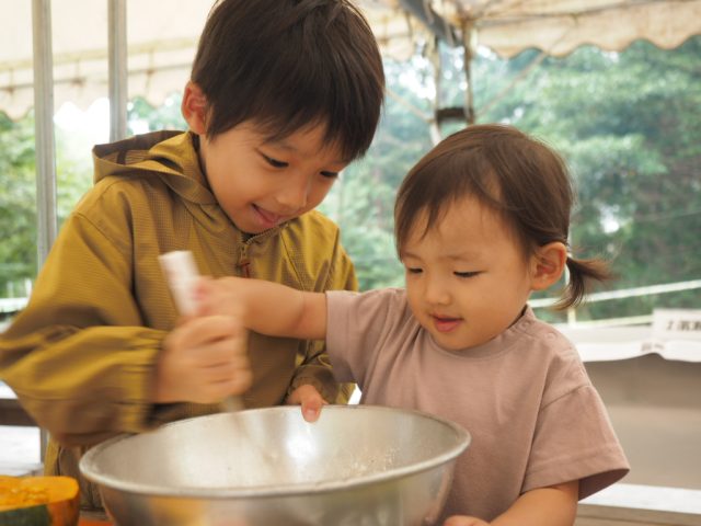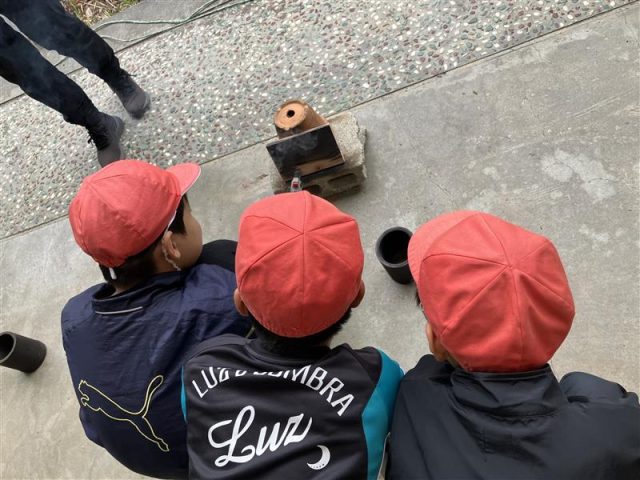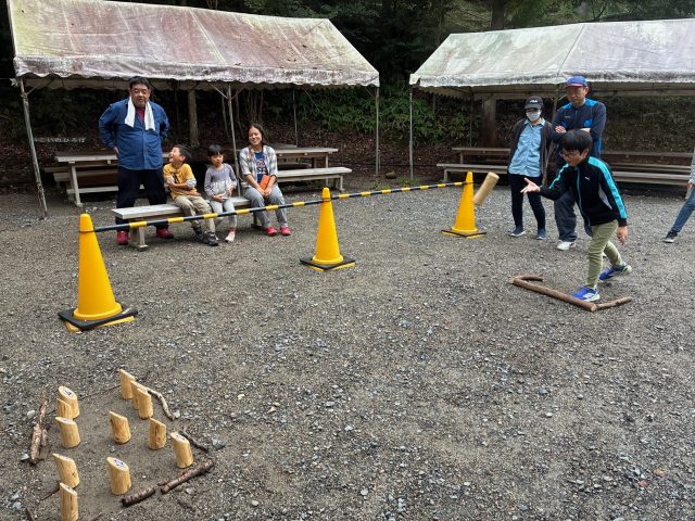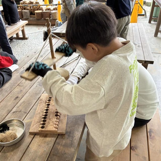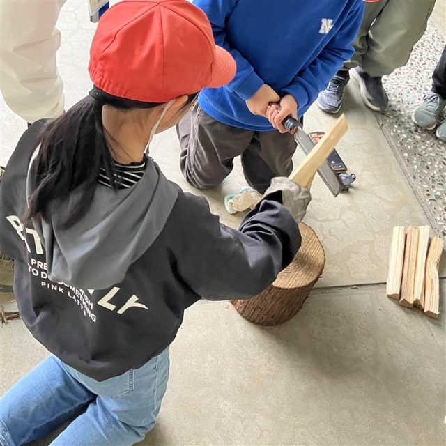 まずは薪割体験にチャレンジ!先生の説明をしっかり聞いて、安全に気を付けながら力いっぱい薪を割っていました。慣れない作業にも一生懸命取り組む姿がとても印象的でした。