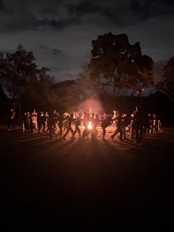 夜はみんなでキャンプファイヤー!少し雨が降っていましたが、火を囲んで歌ったり踊ったり、楽しい時間となりました。そしてそのあとはナイトウォーク。夜の自然の中を歩き、昼間とは違った雰囲気や音を感じることができました。ワクワクと少しドキドキが入り混じった夜の冒険になりました。