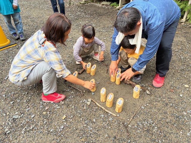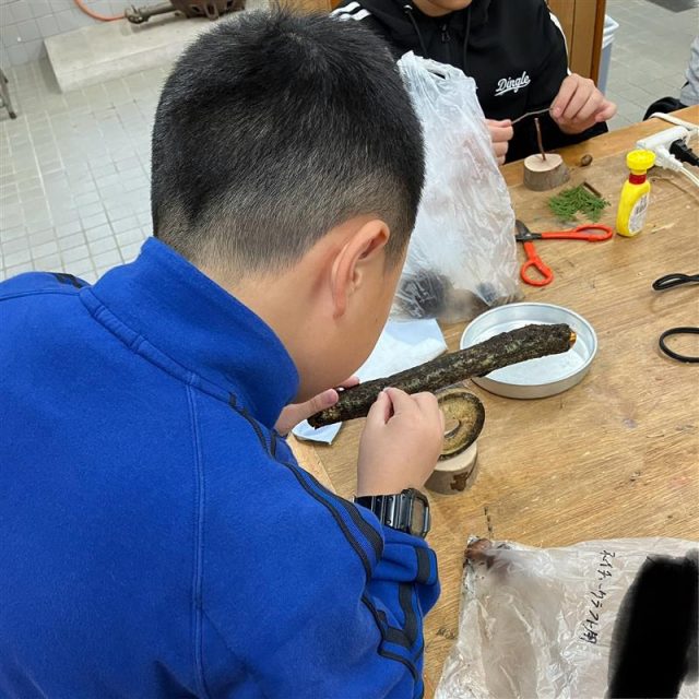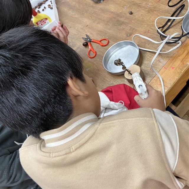 続いてはネイチャークラフト。自然の素材を使い、それぞれの感性で作品作りに挑戦しました。あわせて焼杉体験。バーナーで木を焼き、ポスカでお絵描きをして、オリジナルの焼杉作品が完成しました。色とりどりの作品がたくさん並び、みんなの個性が光っていましたね。