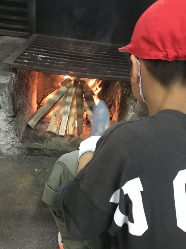 火起こし体験では班のメンバーで協力しながらのまいぎりは大変でしたね、でもついた班もいました!