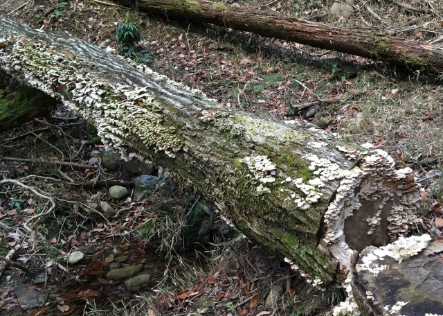 倒れた木にきのこがビッシリ!色も苔で緑色にところどころ白くなっています。