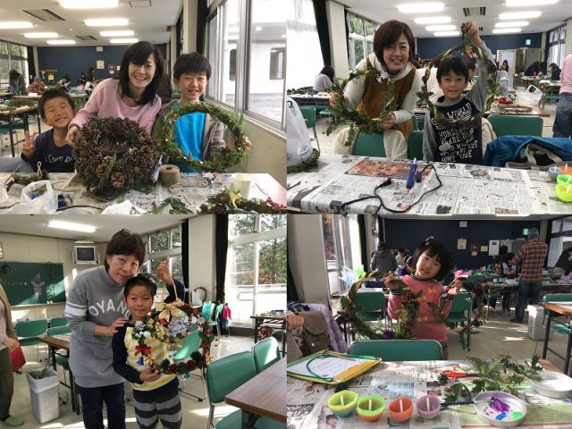 自然の家近辺で採れたツルや木の実をたくさん使って世界に一つだけのリースを作っていただきました。