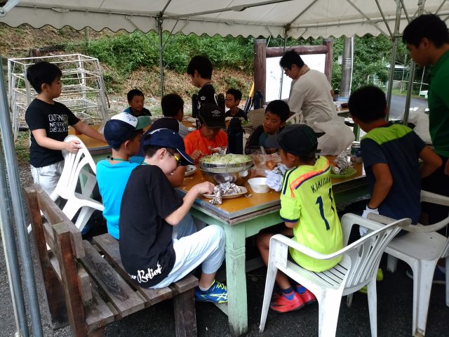 夕方からは雨も小康状態になったので、野外炊事場で野外炊事の定番「カレーづくり」に挑戦しました。