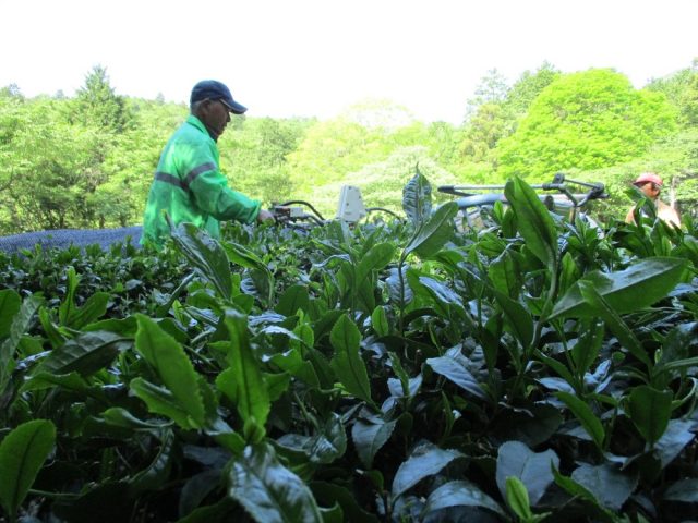 昔は手摘みでしたが、今は機械で刈り取ります。刈り取られたお茶の葉はいくつかの工程を経て、お茶になって自然の家に帰ってきます。今年のお茶の出来が楽しみです。<おっちゃん>